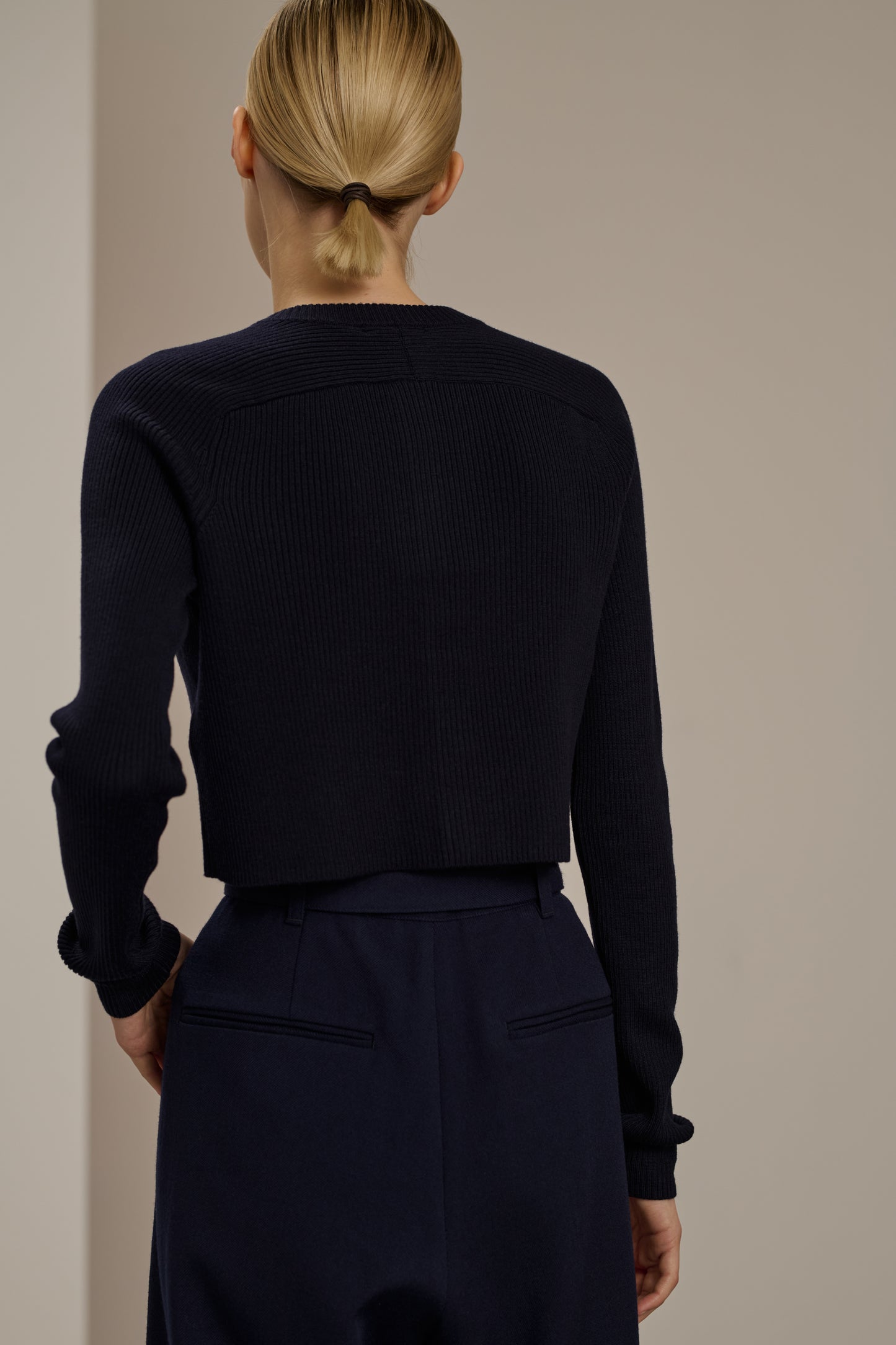 Merino wool rib knit cropped cardigan navy