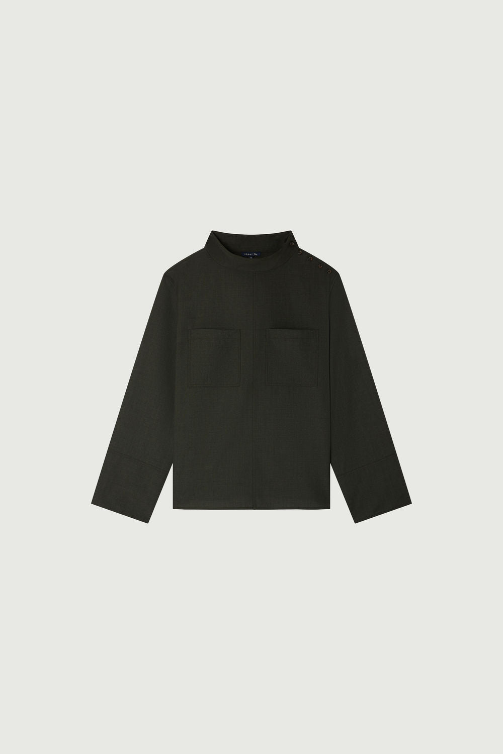 CANNES is a blouse crafted from wool-cotton canvas. Featuring a straight cut and extra-long sleeves, along with a funnel collar set away from the neck, it offers an elegant and comfortable style.