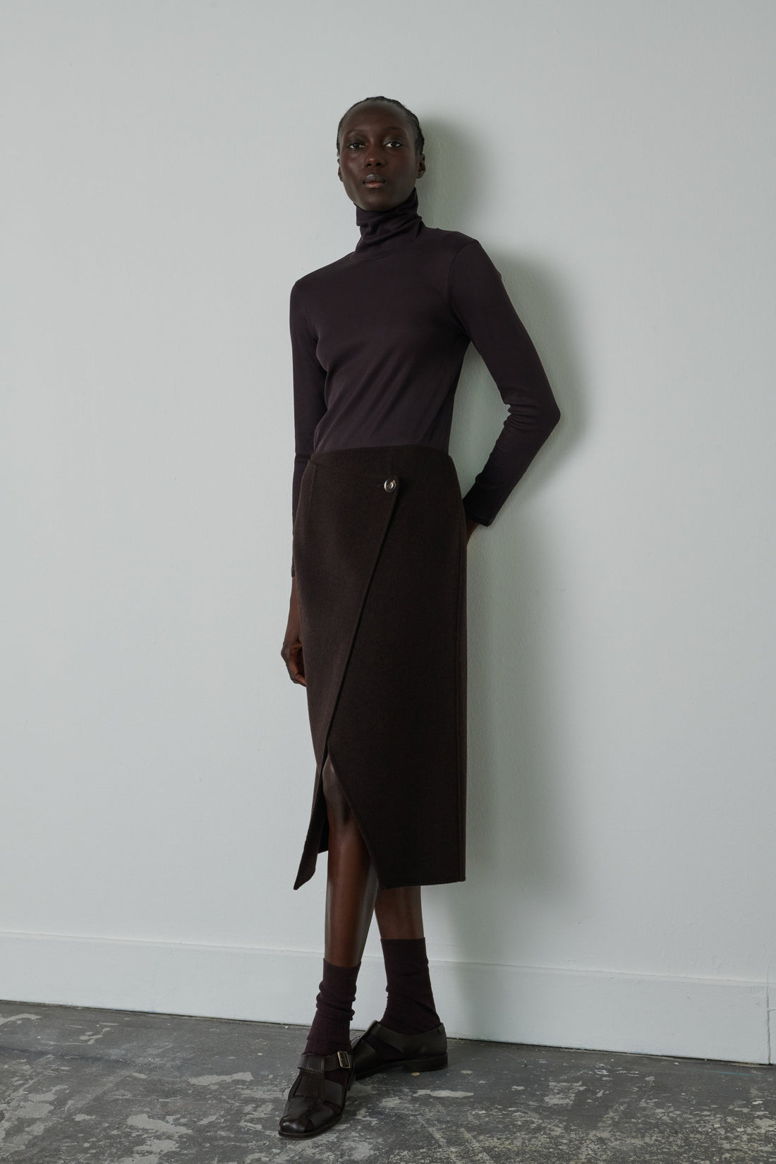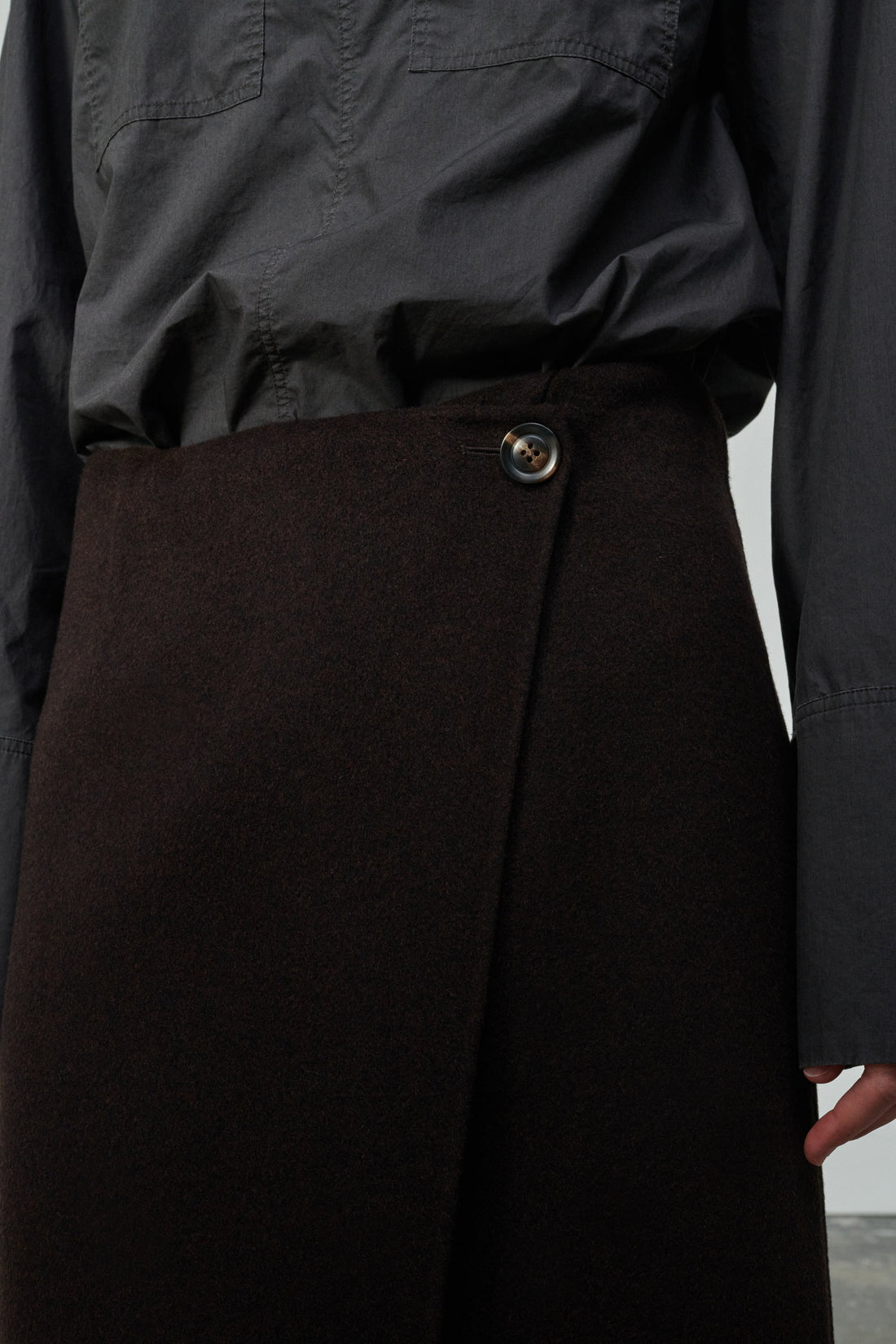 Jupe porte-feuille asymétrique en laine double face - Jupe porte-feuille asymétrique- Volume trapèze, taille haute- Boutonnée sur le côté- Poche passepoilée au dos- Pincée devant et au dos